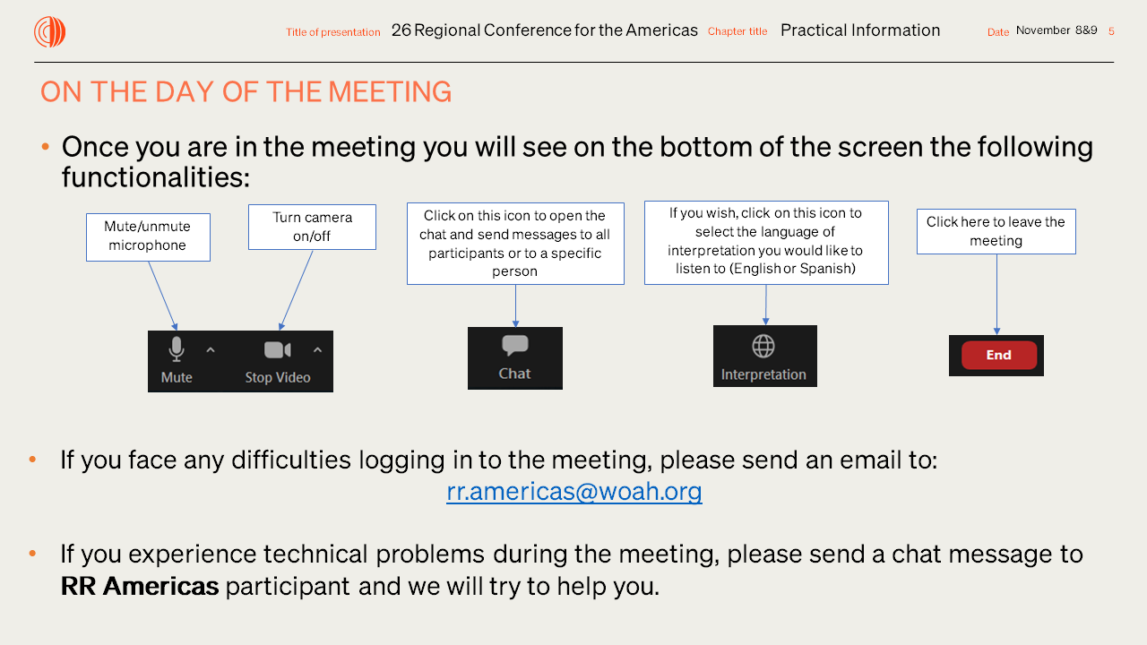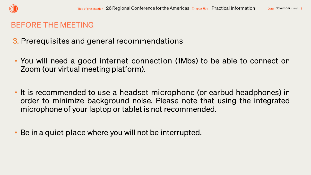 Please note that during the meeting the World Organization for Animal Health will take photographs that will be posted on the World Organization for Animal Health Regional website for the Americas and the RAM Tripartite Sub-regional Project. By appearing in the group photos, you allow the World Organization for Animal Health to use, reproduce and communicate your image worldwide through its website for a limited duration of ten years and for the sole purpose mentioned above. If you do not agree to the terms of the permission of the rights to this photograph, you may refrain from appearing in the group photograph by disabling your webcam. By attending this webinar, you also agree to be video recorded by the World Organisation for Animal Health, for distribution to World Organisation for Animal Health staff members for the purpose of writing a report, for as long as necessary to write the report. If you do not agree to the terms of this video recording authorization, you may refrain from attending the meeting.