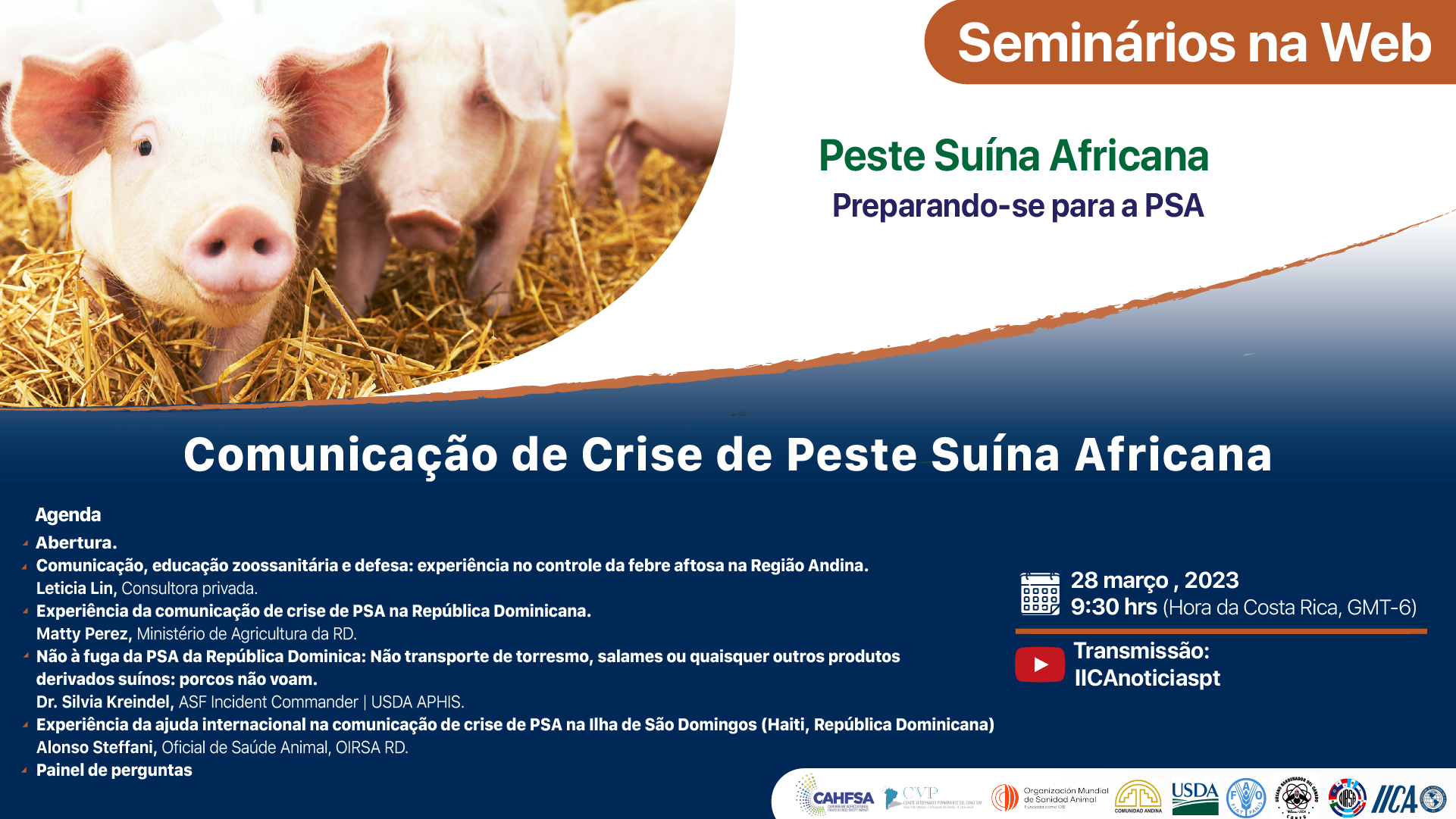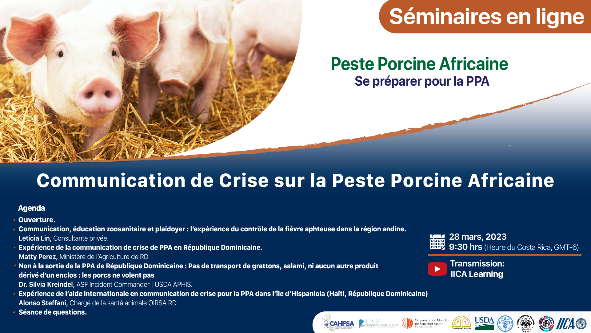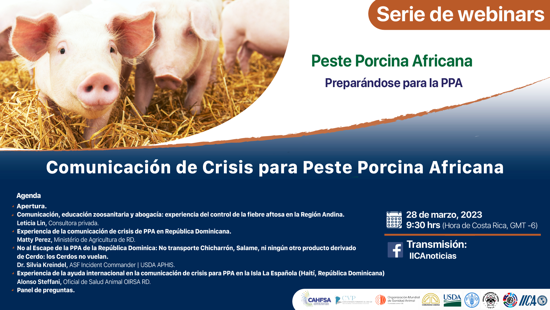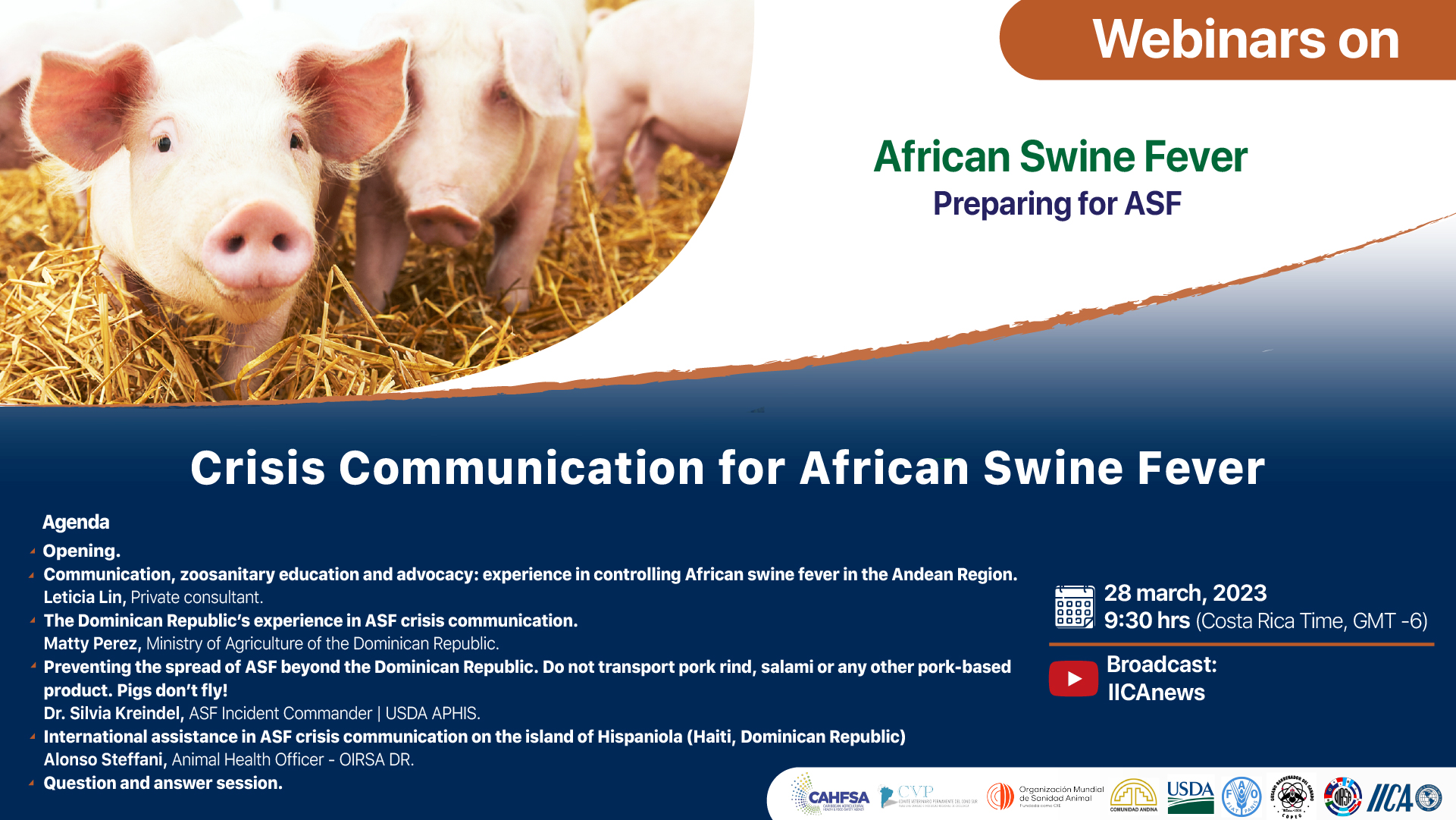 Within The Global Framework for the Progressive Control of Transboundary Animal Diseases (GF-TADs), an Emergency Management Regional Team was created, with the aim of coordinating and monitoring all the activities during the emergency. This committee under the IICA’s coordination, is launching a series of webinars on the most relevant topics related to ASF.