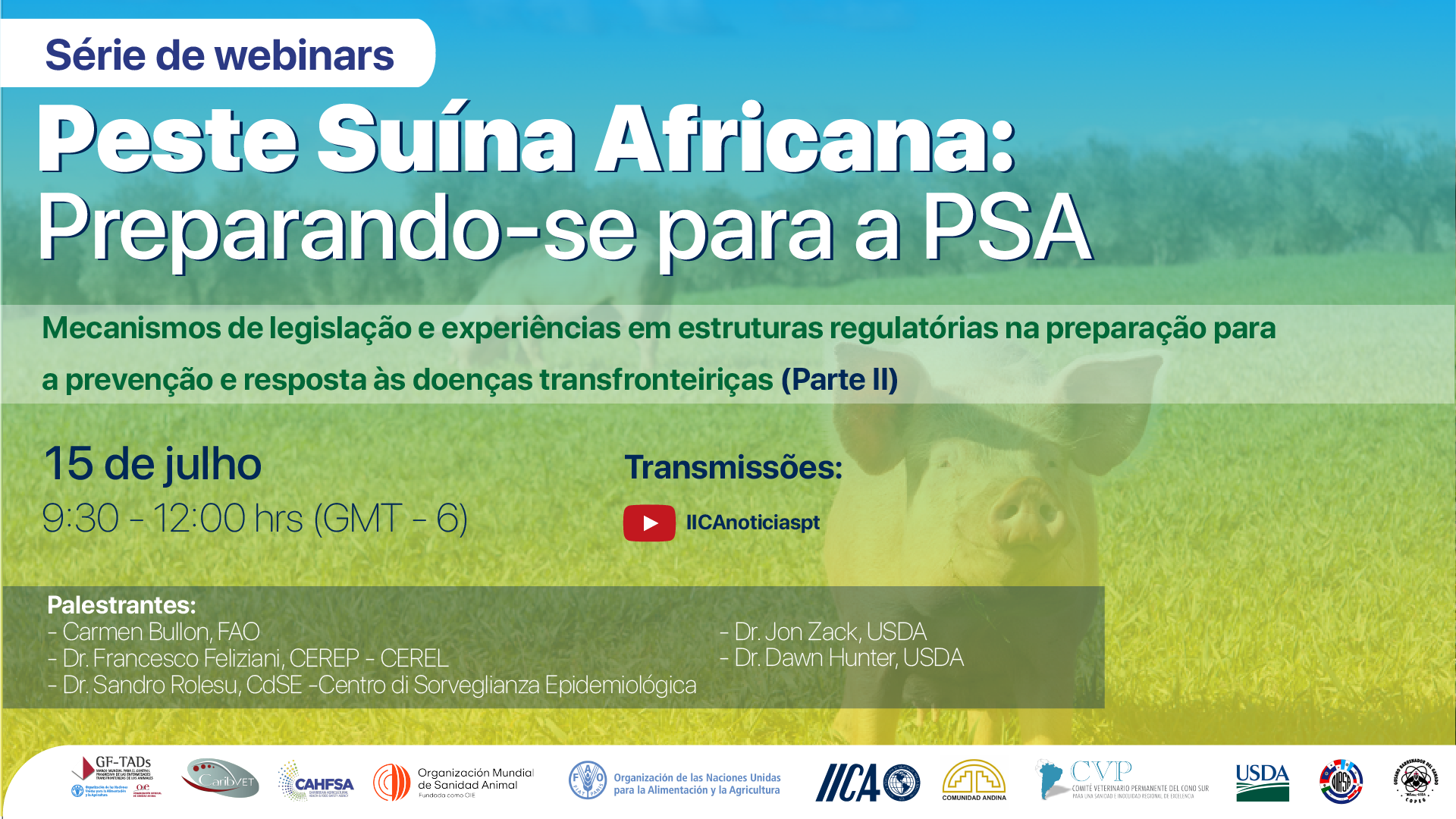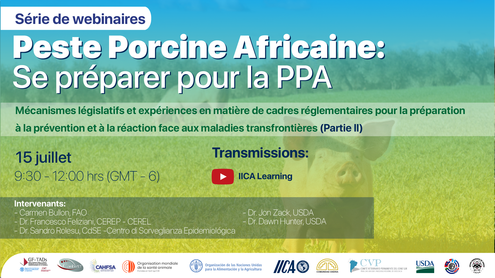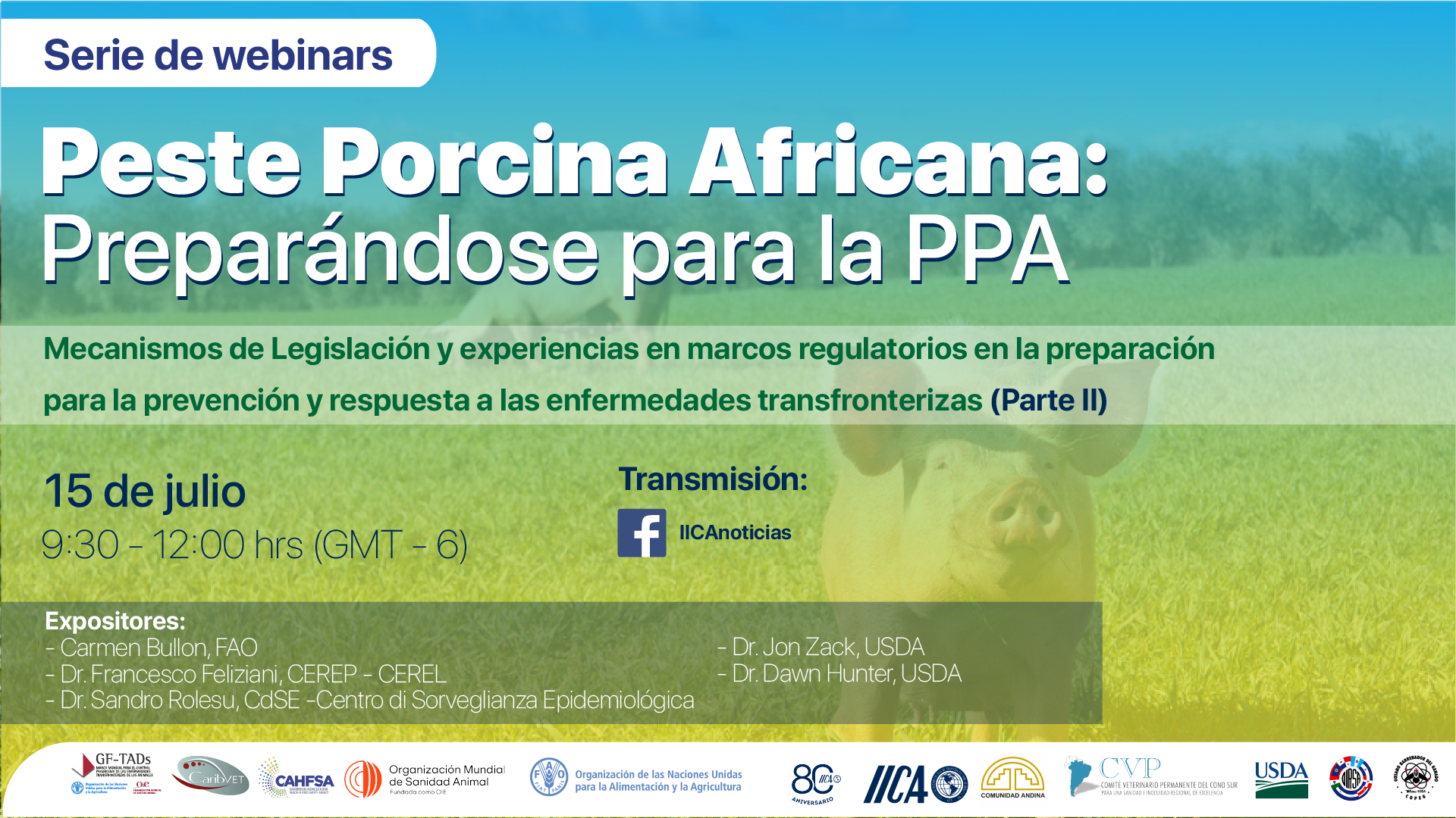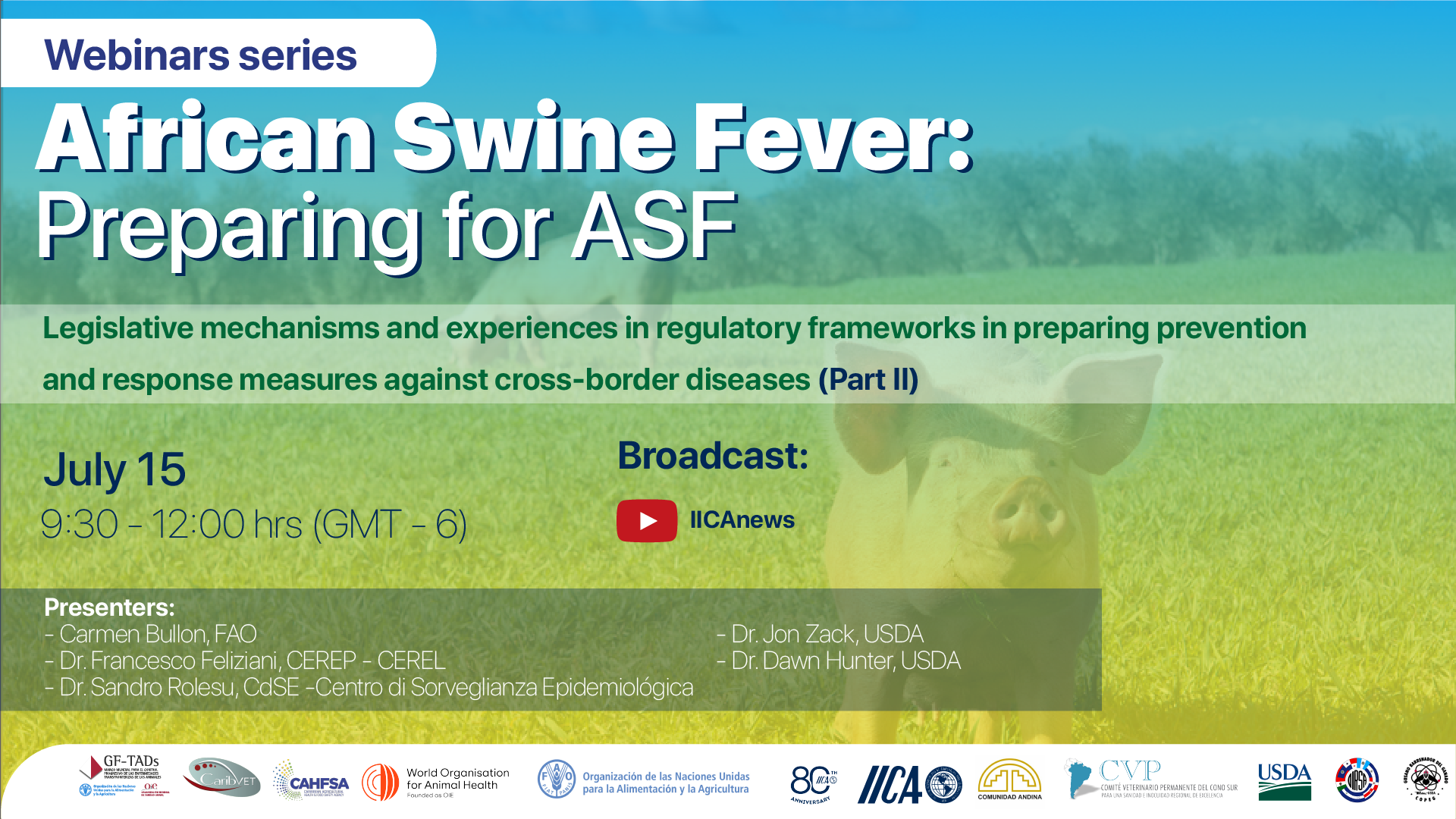 Within The Global Framework for the Progressive Control of Transboundary Animal Diseases (GF-TADs), an Emergency Management Regional Team was created, with the aim of coordinating and monitoring all the activities during the emergency. This committee under the IICA’s coordination, is launching a series of webinars on the most relevant topics related to ASF.