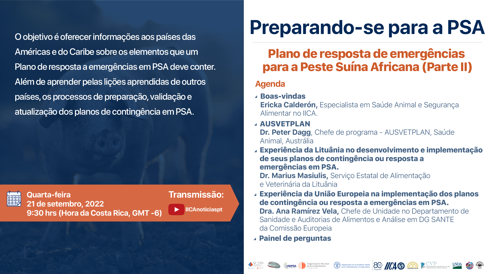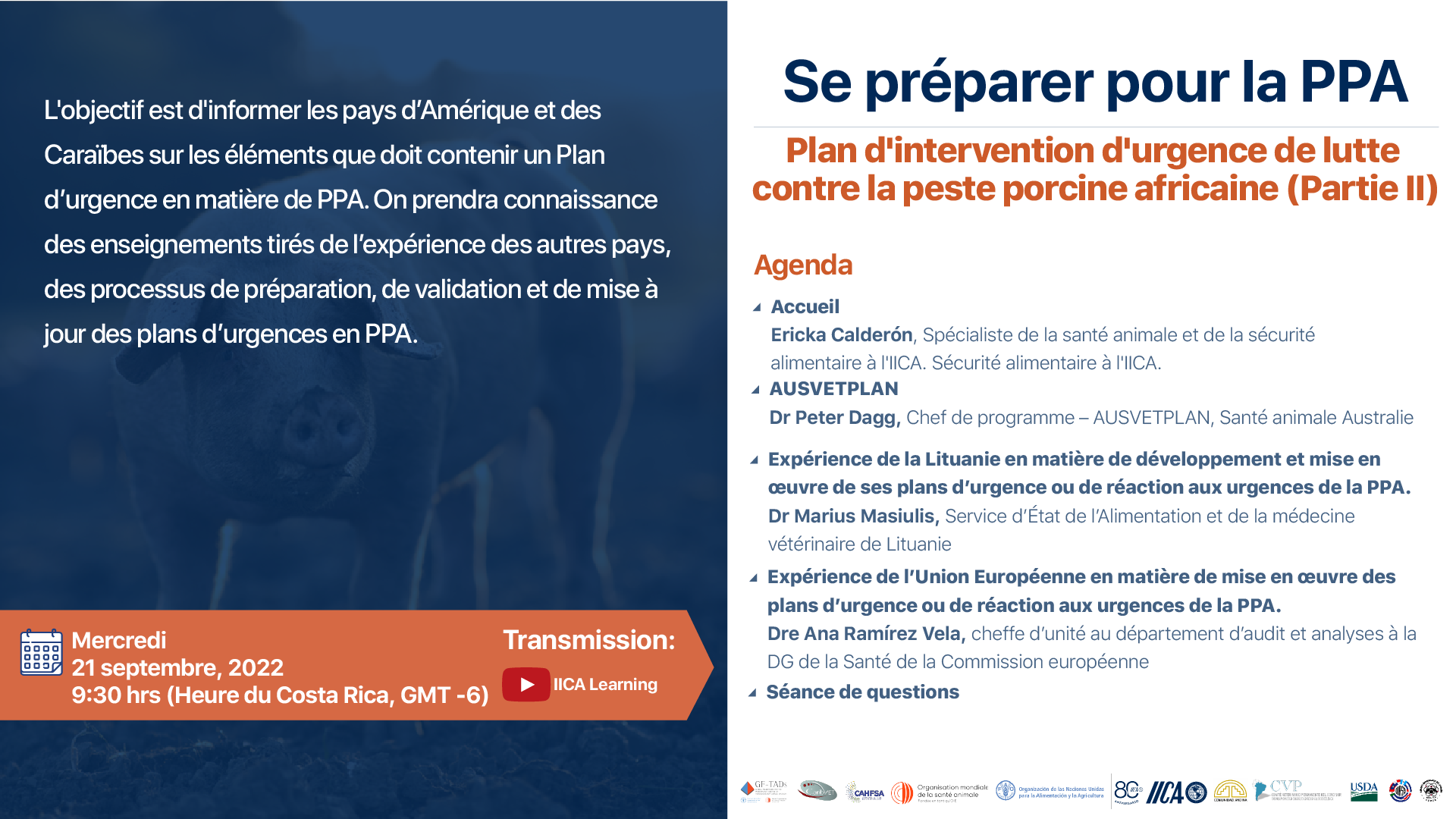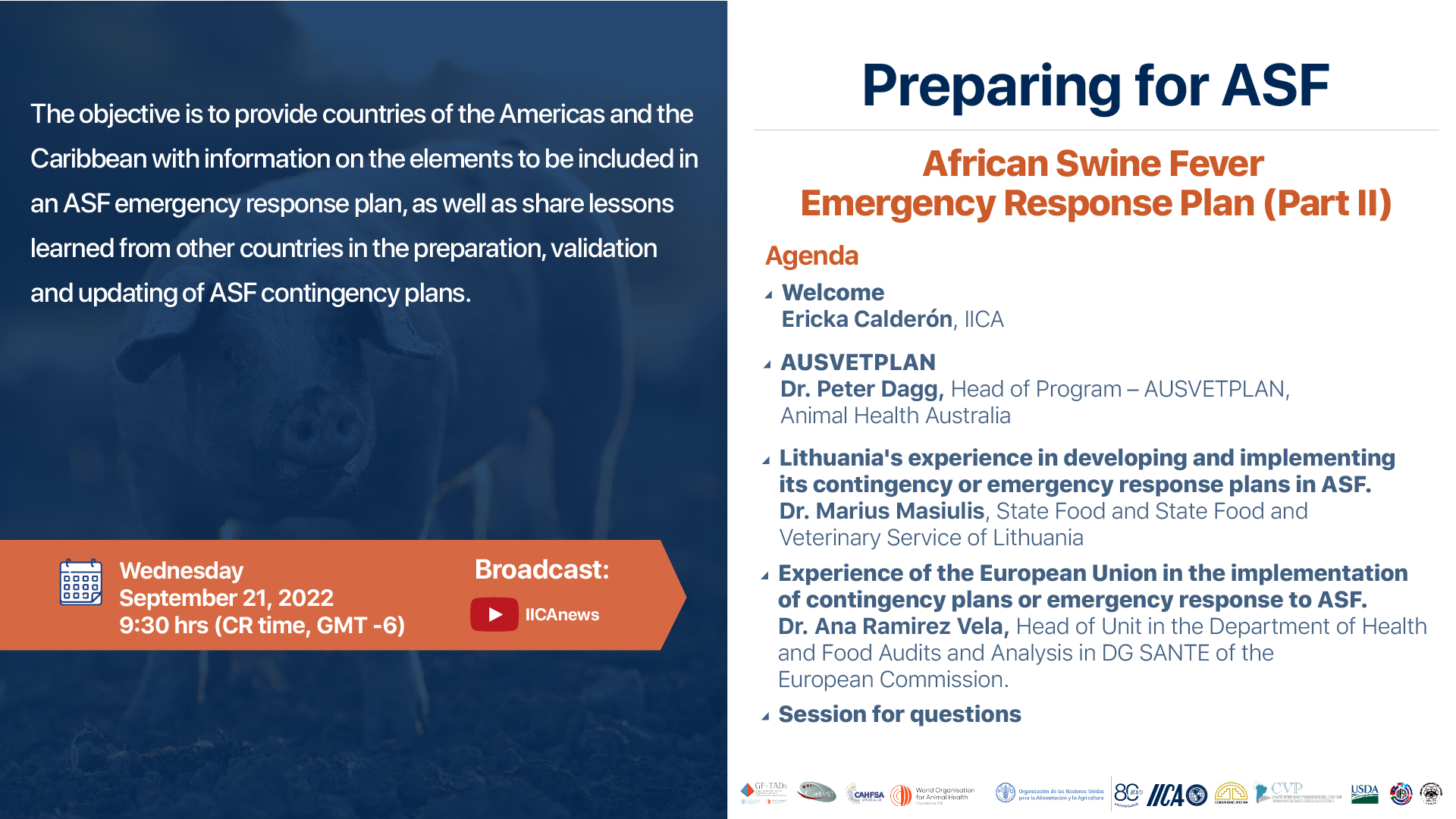 Within The Global Framework for the Progressive Control of Transboundary Animal Diseases (GF-TADs), an Emergency Management Regional Team was created, with the aim of coordinating and monitoring all the activities during the emergency. This committee under the IICA’s coordination, is launching a series of webinars on the most relevant topics related to ASF.