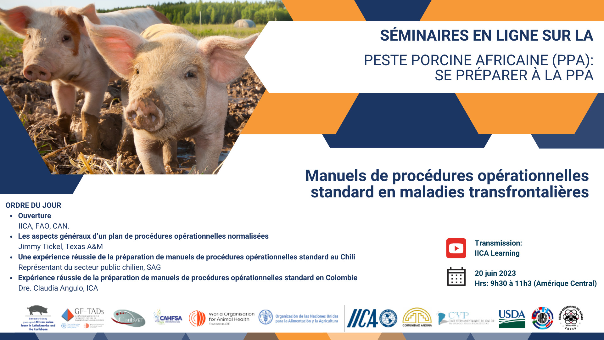 Within The Global Framework for the Progressive Control of Transboundary Animal Diseases (GF-TADs), an Emergency Management Regional Team was created, with the aim of coordinating and monitoring all the activities during the emergency. This committee under the IICA’s coordination, is launching a series of webinars on the most relevant topics related to ASF.
