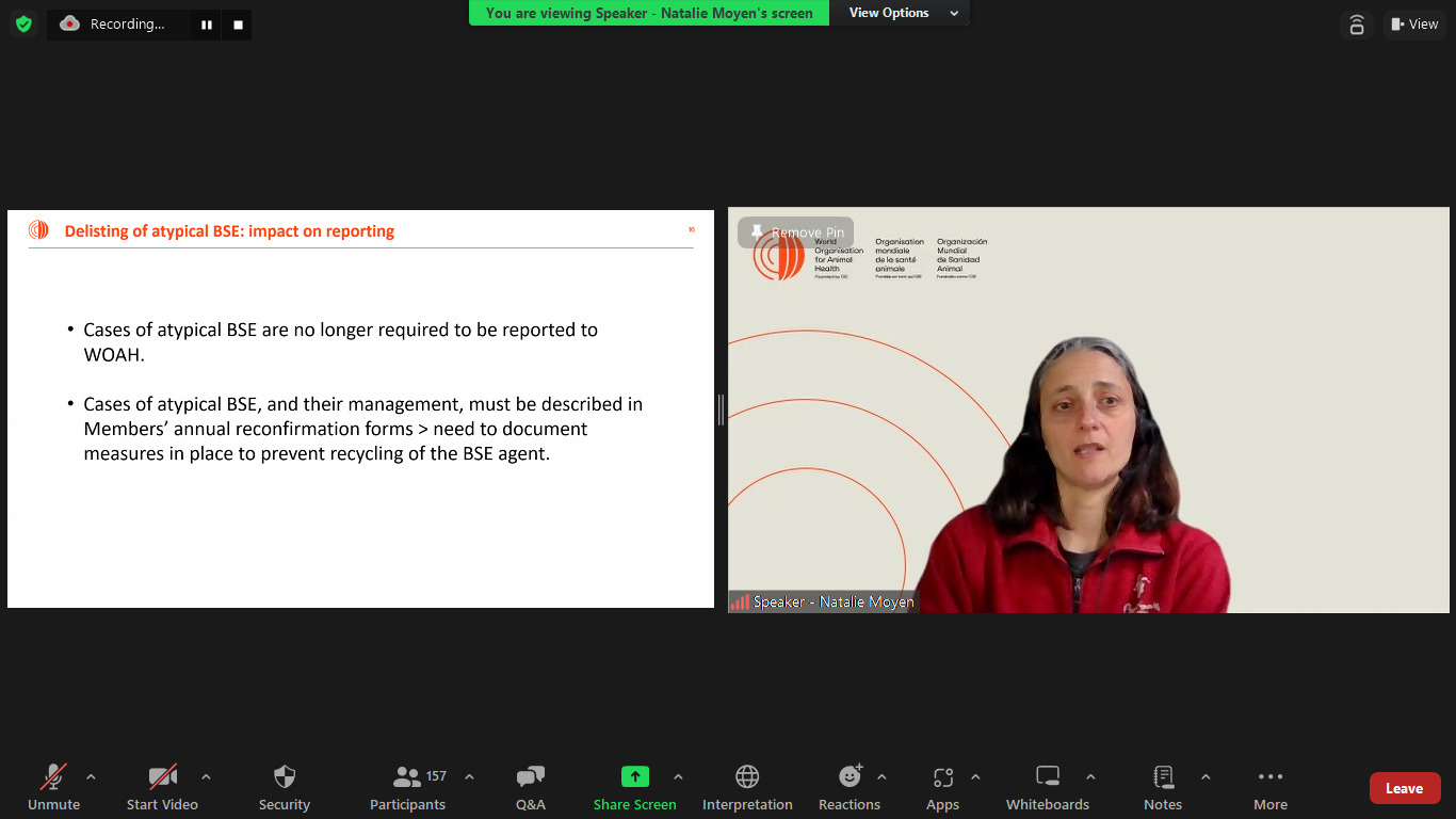 Además de una presentación sobre los contenidos actualizados del capítulo, otras presentaciones abarcaron temas relacionados con su impacto en el comercio y la actualización de los requisitos para el reconocimiento oficial del estatus de riesgo de EEB y su reconfirmación por la OMSA. Además, se hizo una presentación sobre las directrices para la vigilancia específica de la EEB. Por último, se presentó la experiencia de Canadá.