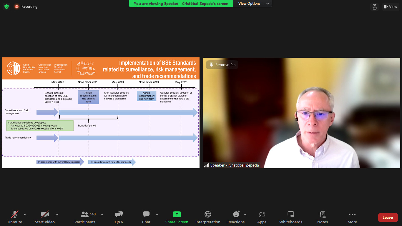 El principal objetivo de la reunión fue presentar las actualizaciones del capítulo del Código Terrestre sobre la encefalopatía espongiforme bovina, adoptadas en la Sesión General de mayo de 2023.