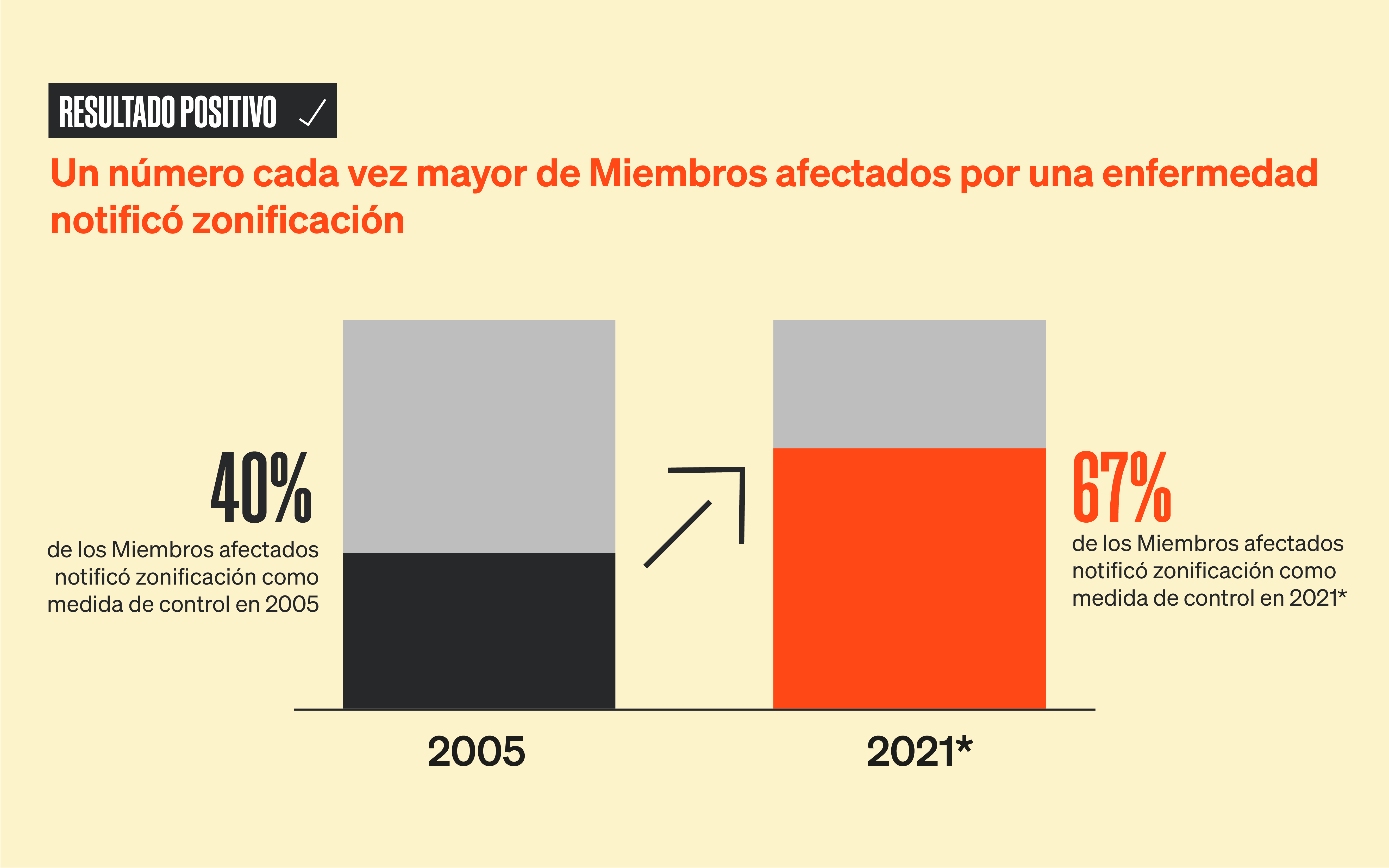 El porcentaje de Miembros de la OMSA afectados por una enfermedad que reportan el uso de la zonificación como medida de control aumentó del 40 % en 2005 al 67 % en 2021. *2021 es el último año para el cual los datos disponibles son los más completos.